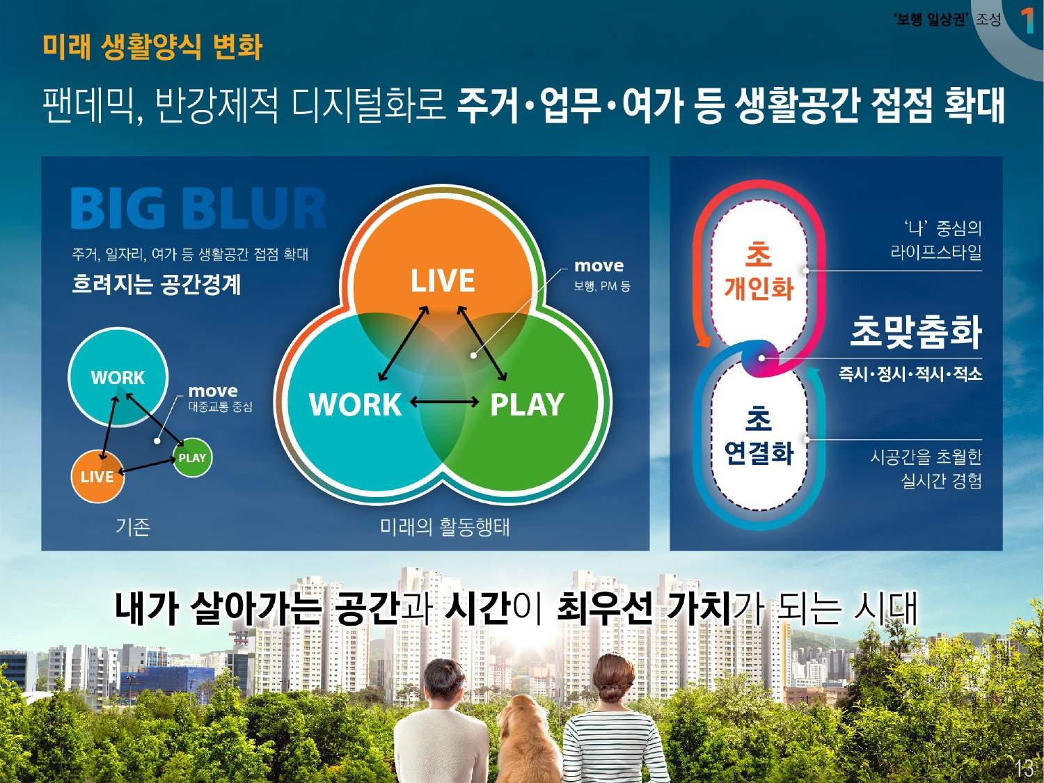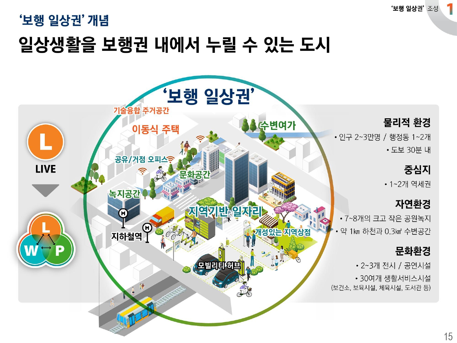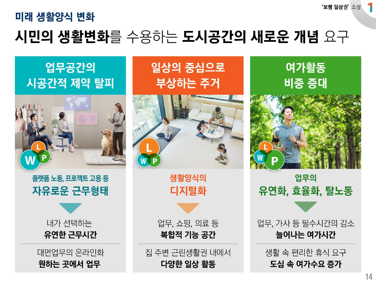 첫번째 내용은 보행 일상권 조성에 대한 내용인데, 삶이 변화하면서 주거, 업무, 여가 등의 생활공간의 접점이 확대되기 때문에 이를 모두 누릴 수 있는 새로운 도시공간에 대한 내용이 나와있습니다.