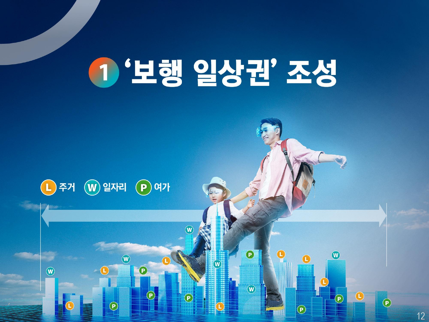첫번째 내용은 보행 일상권 조성에 대한 내용인데, 삶이 변화하면서 주거, 업무, 여가 등의 생활공간의 접점이 확대되기 때문에 이를 모두 누릴 수 있는 새로운 도시공간에 대한 내용이 나와있습니다.